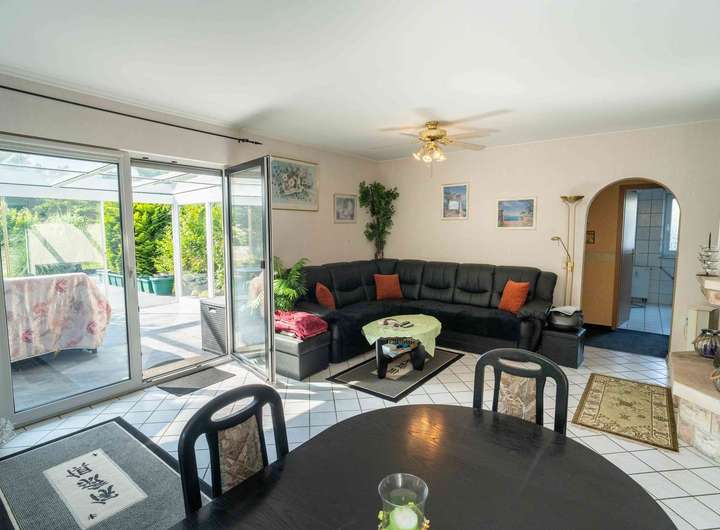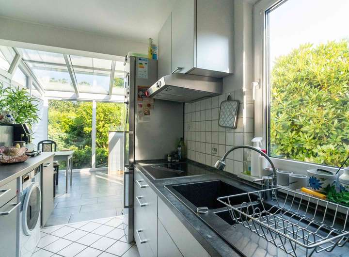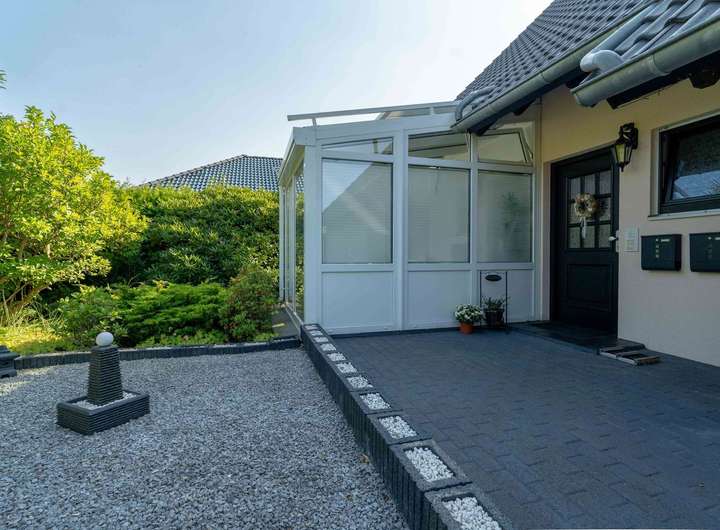 Ein kleiner Flur öffnet sich direkt ins Wohnzimmer. Licht fällt durch große Glasflächen und den anschließenden Wintergarten, der zum Garten hin ausgerichtet ist. Hier verschmelzen Innen- und Außenraum, besonders in den Abendstunden, wenn die Sonne von Westen hereinscheint. Links vom Flur liegt die Küche, hell durch den integrierten Wintergarten. Rechts vom Wohnzimmer führt ein weiterer Flur zu den privaten Räumen: ein Schlafzimmer, ein Badezimmer und der praktische Hauswirtschaftsraum, der direkten Zugang in die Garage bietet.