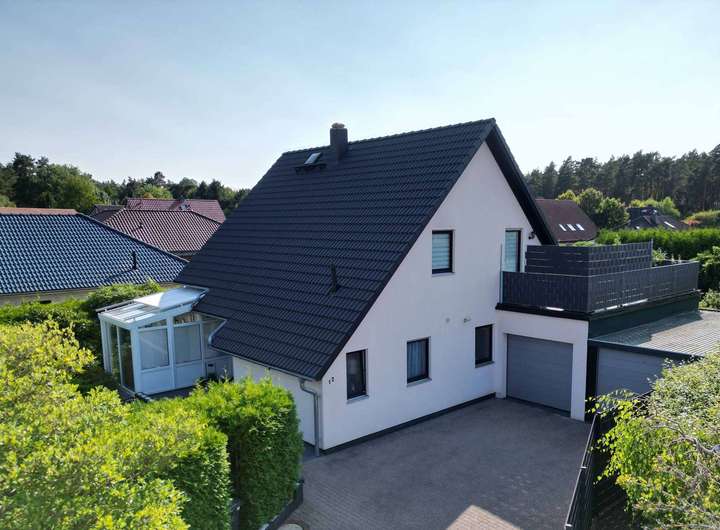 Ein kleiner Teich, harmonische Bepflanzung und viel Platz für Rückzug und Genuss. Zwei Garagen runden das Angebot ab. Aus Rücksicht auf die Privatsphäre des aktuellen des aktuellen Mieters wird auf Innenaufnahmen der Dachgeschosswohnung verzichtet.