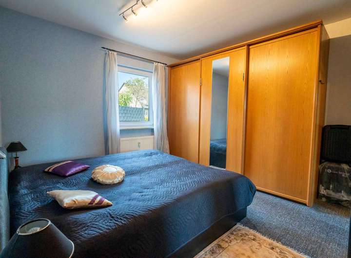Über den Windfang betreten Sie das Haus. Von hier aus führt der Weg geradeaus in die Erdgeschosswohnung, rechts über das Treppenhaus in die Wohnung im Dachgeschoss. Schon dieser erste Eindruck macht deutlich: zwei klar getrennte, eigenständige Wohneinheiten, die zugleich unter einem Dach verbunden sind.