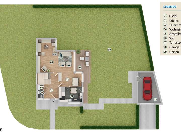 Das Auto parkt bequem in der auf dem Grundstück liegenden Garage.