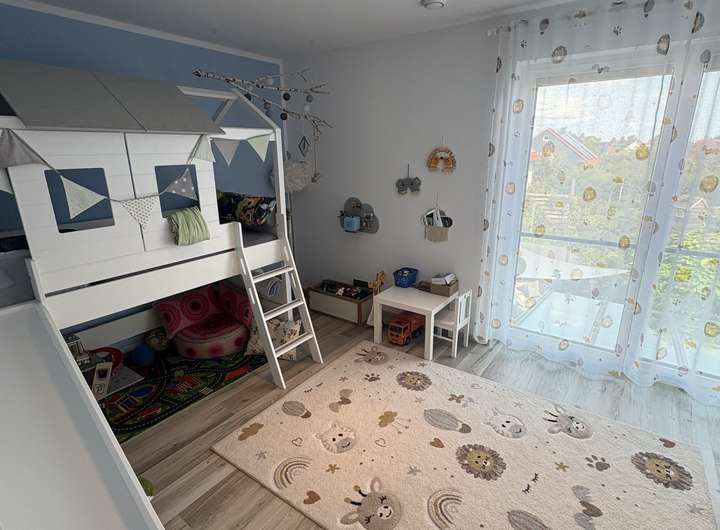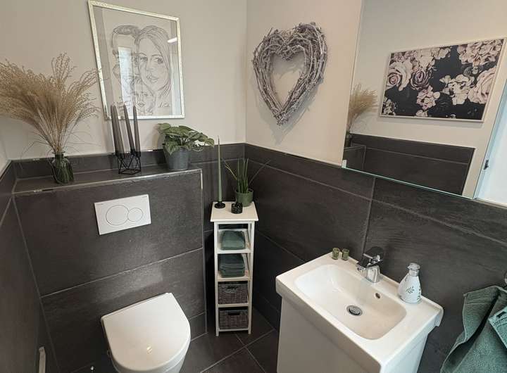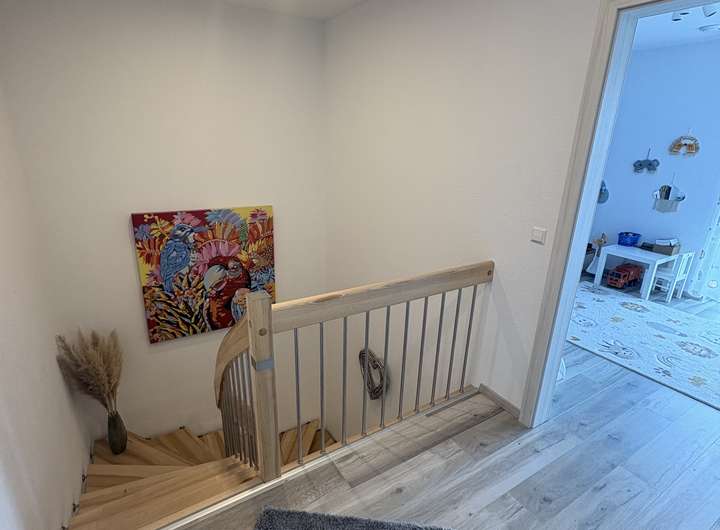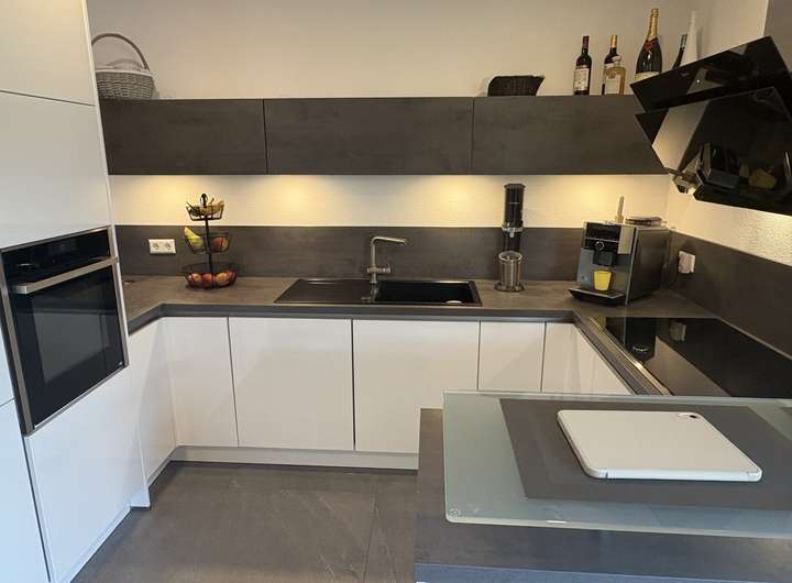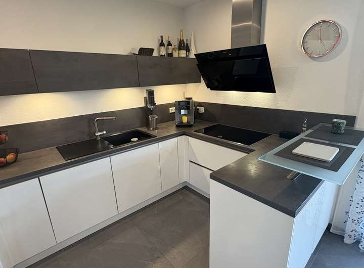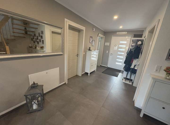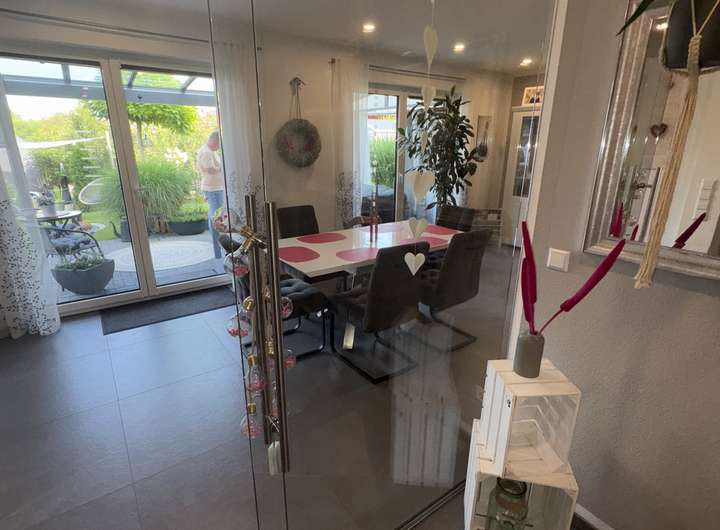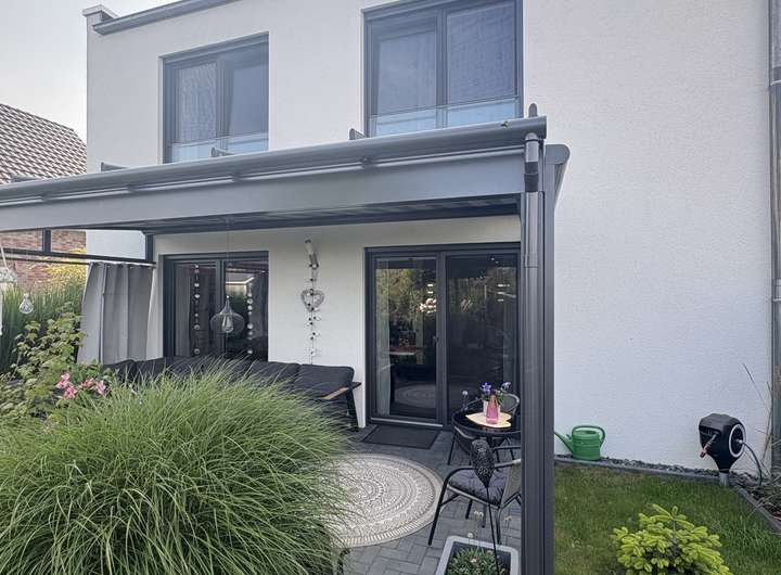 Erdgeschoss: Beim Betreten des Hauses empfängt Sie ein besonders großzügig geschnittener Eingangsbereich, der einen repräsentativen ersten Eindruck vermittelt. Von hier aus gelangen Sie in ein praktisches Büro, respektive Gästezimmer, das Gäste-WC sowie den Hauswirtschaftsraum, der mit dem Innengerät der Wärmepumpe, einem Wasserspeicher sowie Anschlüssen für Waschmaschine und Trockner ausgestattet ist. Über eine raumhohe Glasschiebetür betreten Sie den ca. 36 m² großen Wohnbereich mit offener Küche. Der lichtdurchflutete Raum überzeugt durch seine moderne Gestaltung und stilvolle Großformatfliesen. Die hochwertige weiße Einbauküche mit Markengeräten der Firma NEFF ist bereits im Kaufpreis enthalten und erfüllt höchste Ansprüche an Funktionalität und Design. Vom Wohnbereich aus gelangen Sie direkt auf die großzügige Terrasse, die mit einer neuwertigen, hochwertigen Terrassenüberdachung ausgestattet ist. Diese verfügt über eine elektrische Beschattung – auch an den Seiten – und lädt zum Verweilen ein. Der angrenzende, pflegeleicht angelegte Garten präsentiert sich als grüne Oase mit liebevoller Bepflanzung.