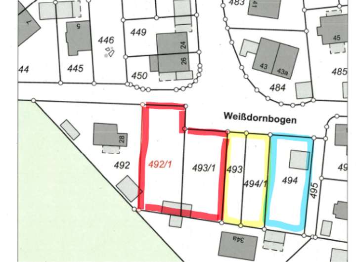 Baugrund mit rund 1040 m2 für ein Einfamilienhaus mit rund 205 m2 möglicher Geschoßfläche - Kaufpreis 1.159.000 € - in der Flrukarte rot dargestellt.