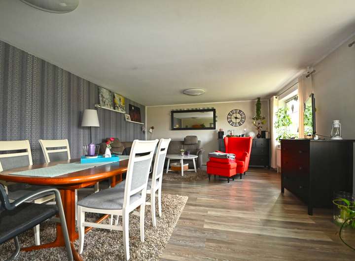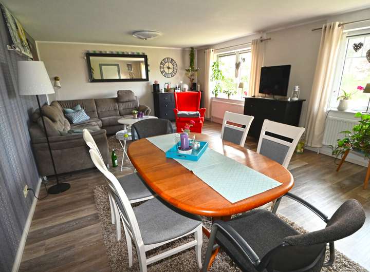 Die Wohnfläche von ca. 179 m² erstreckt sich über zwei Etagen und umfasst insgesamt fünf gut geschnittene Zimmer, darunter ein behagliches Wohnzimmer sowie eine geräumige Küche. Zwei Badezimmer sorgen für zeitgemäßen Komfort und Funktionalität.