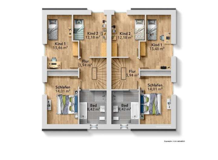 Dachgeschoss: Flur, Elternzimmer, Badezimmer, Kinderzimmer I und Kinderzimmer II