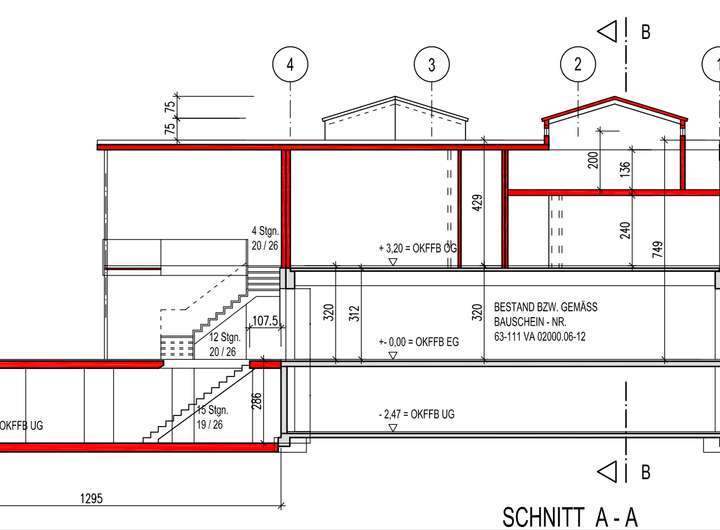 Der Bestand umfasst aktuell eine realisierte Rohbaufläche von ca. 1.300 m², verteilt auf eine Grundstücksfläche von ca. 700 m². Die Flächen gliedern sich wie folgt: