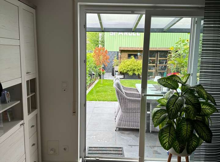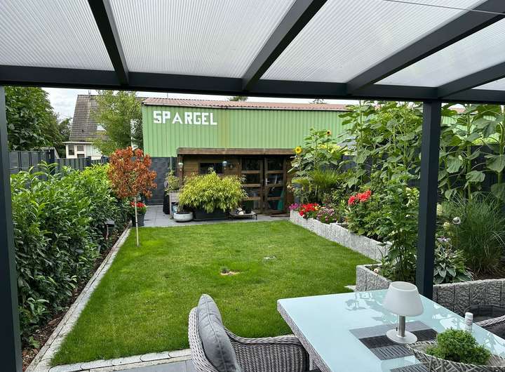 Dank großer Fensterfronten genießen Sie einen herrlichen Blick in den 2024 neu gestalteten, blickdichten und komplett eingezäunten Garten. Dort erwartet Sie ein modernes Gartenhaus mit viel Stauraum sowie eine großzügige, überdachte Terrasse mit integrierter elektrischer Unterdachmarkise – ideal zum Entspannen, auch an heißen Tagen. Die automatische Bewässerungsanlage übernimmt die Pflege fast von selbst.