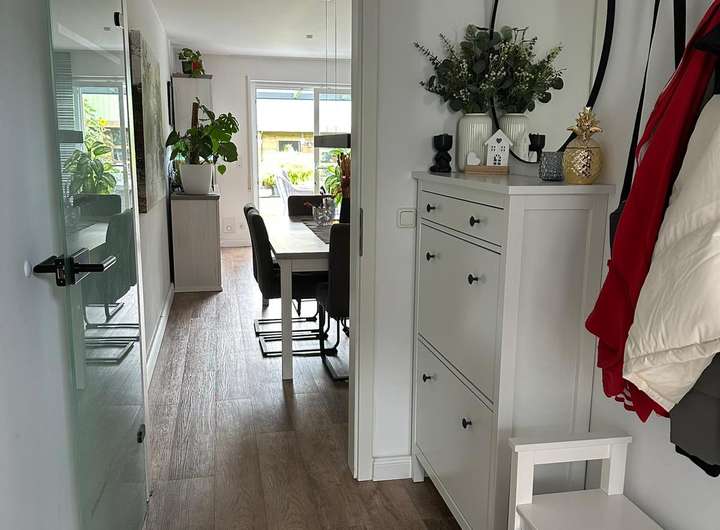 Im Eingangsbereich heißt Sie eine Garderobe willkommen. Eine stilvolle Glastür trennt diesen Bereich vom Wohnraum und sorgt gleichzeitig für Helligkeit.