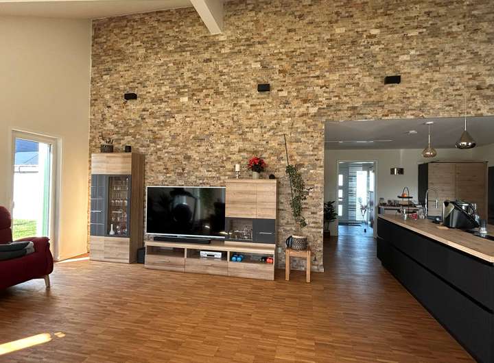 • Giebeloffener Wohnraum, mit Travertin-Naturstein-Wandverblender