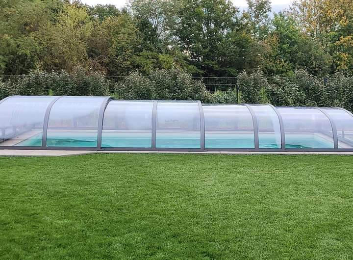 • Auf Maß gefertigte Poolüberdachung der Fa. Vöroka