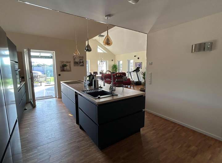 Das umfangreiche Smart-Home-System von Somfy bietet viele Annehmlichkeiten und erhöht die Sicherheit des Zuhauses. Der offene Wohn- Essbereich mit angrenzender Küche lädt zu geselligen Stunden mit Freunden und Familie ein.