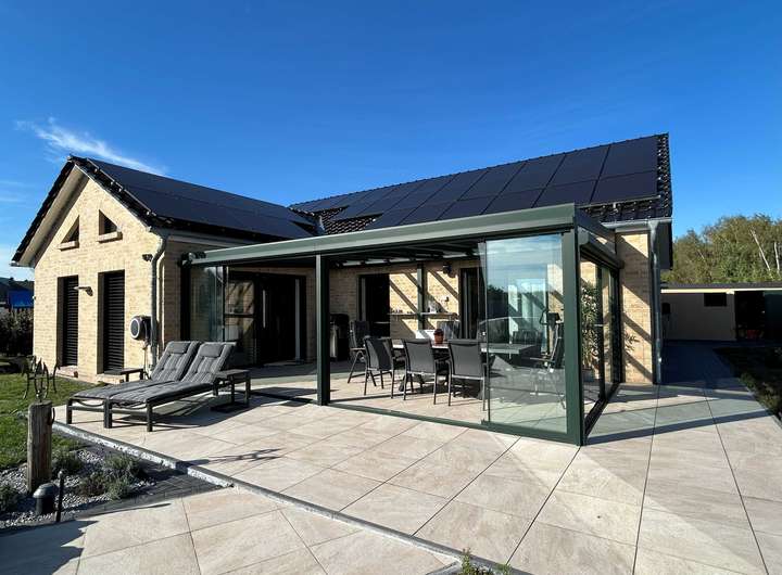• Terrasse, ca. 56 m2, mit Feinsteinzeug von Villeroy & Boch, ca. 28 m2 davon mit Terrassenüberdachung der Fa. Schweng mit Dach- und Senkrecht-Markisen, Beleuchtung und Glasschiebeanlage