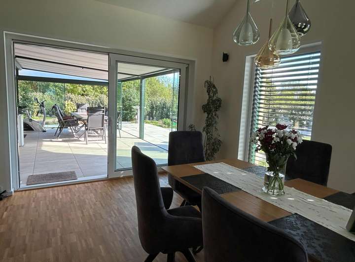 • Terrassentüren mit bodenebener Schwelle (Schlafzimmer, Küche, Essbereich)