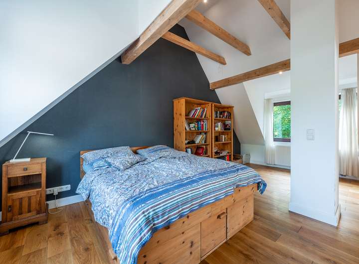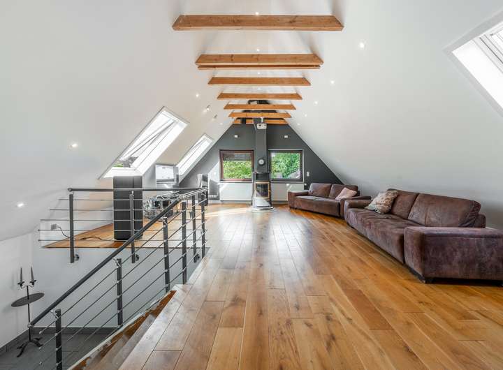 Im Obergeschoss erwartet Sie ein großzügiges, giebelhohes Raumkonzept. Die Unterteilung von Schlafzimmer und Wohnbereich ist geräumig und ansprechend umgesetzt.