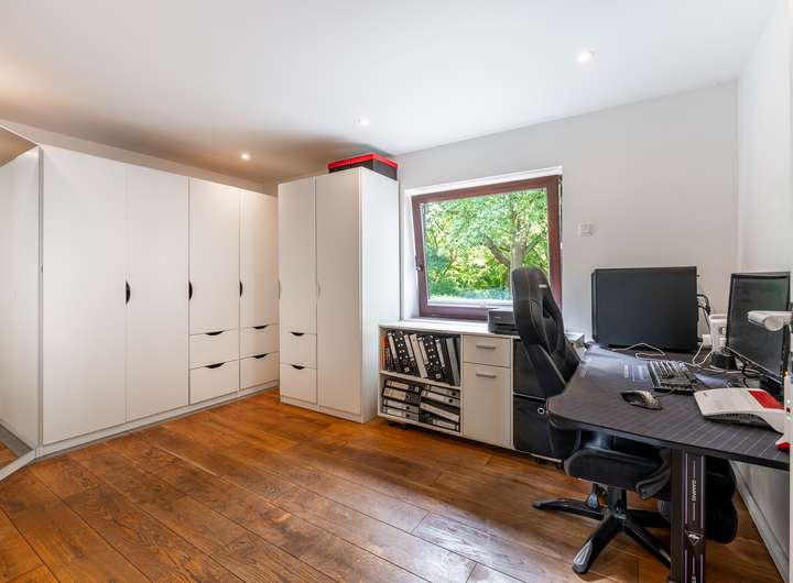 Rechtsseitig gelangen Sie in die moderne und hochwertig ausgestattete Küche, die mit einer klaren und funktionalen Raumaufteilung überzeugt und ausreichend Platz für einen Essbereich bietet. Besonders komfortabel ist der direkte Zugang in das angrenzende Zimmer, das aktuell als Büro genutzt wird. Ob Homeoffice, Gästezimmer, Schlafzimmer oder Essbereich – hier eröffnen sich vielseitige Nutzungsmöglichkeiten. Das Erdgeschoss vereint somit Wohnkomfort, Helligkeit und eine durchdachte Struktur zu einem stimmigen Gesamtbild.