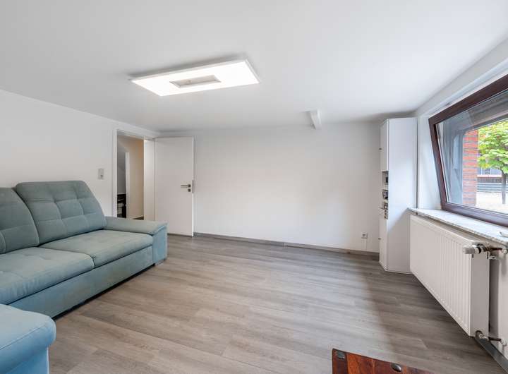 Im Hochparterre zur linken Seite befindet sich das großzügige Wohnzimmer. Eine große Fensterfront lässt reichlich Tageslicht in den Raum und schafft eine freundliche, einladende Atmosphäre – ideal für entspannte Stunden mit der Familie oder gesellige Abende. Dieser Raum könnte auch als Schlafbereich in einer anderen Aufteilung gut funktionieren. Ebenfalls vom zentralen Flur erreichbar ist das Badezimmer, das durch seine praktische Lage für alle Räume optimal zugänglich ist. Das Bad könnte auf Wunsch der neuen Eigentümer umgestaltet werden.