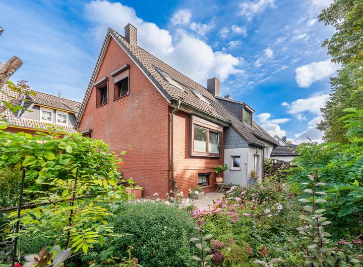 Das Grundstück der charmanten Doppelhaushälfte betreten Sie an der Südseite des Grundstücks.