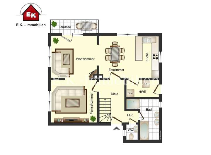 Flur, Tageslicht-Badezimmer mit Wanne und Dusche, offener Küchen-Essbereich, Wohnzimmer mit Kaminofen, Fernsehzimmer, Flur mit Waschmaschinenanschluss, Gäste WC