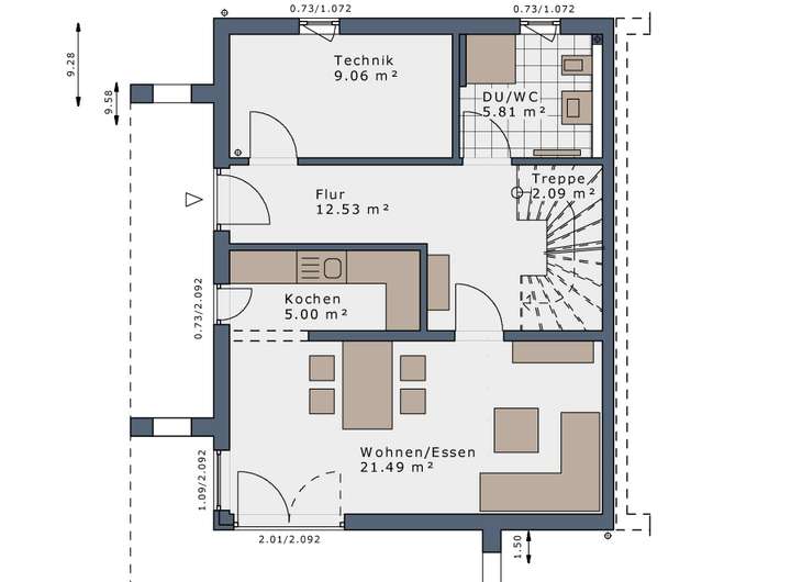 - Bodenplatte inkl. Effizienzhaus 55 Perimeter-Dämmung unterhalb der Bodenplatte sowie stirnseitig