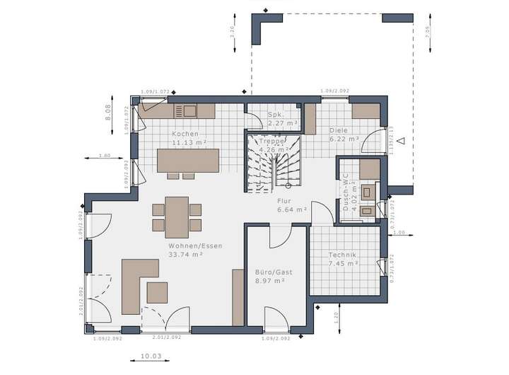 - Bodenplatte inkl. Effizienzhaus 55 Perimeter-Dämmung unterhalb der Bodenplatte sowie stirnseitig