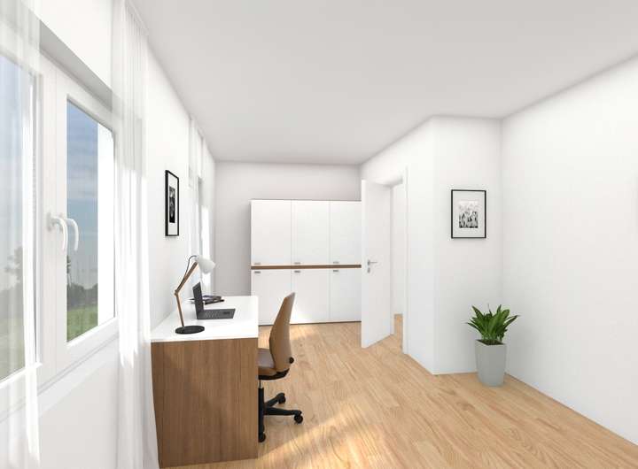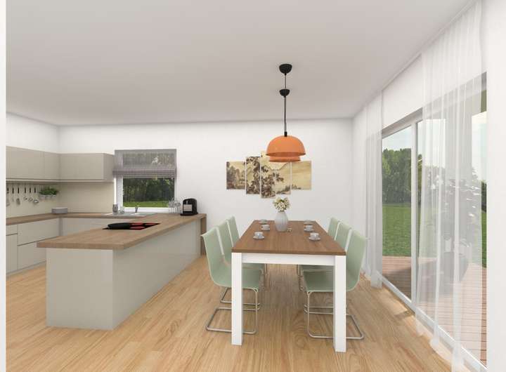Neben einem Zwerchgiebel, einem Dreiecksfenster im Giebel und einem überdachten Hauseingangsbereich wird eine spannende Raumaufteilung geschaffen, die zum Wohlfühlen einlädt. Der große Wohn- und Essbereich ist durch zwei doppelflügelige Türen mit der Terrasse verbunden und schenkt dem knapp 47 m² großen Raum Helligkeit. Die zwei zusätzlichen Zimmer im Dachgeschoss haben direkten Zugang zum Balkon.