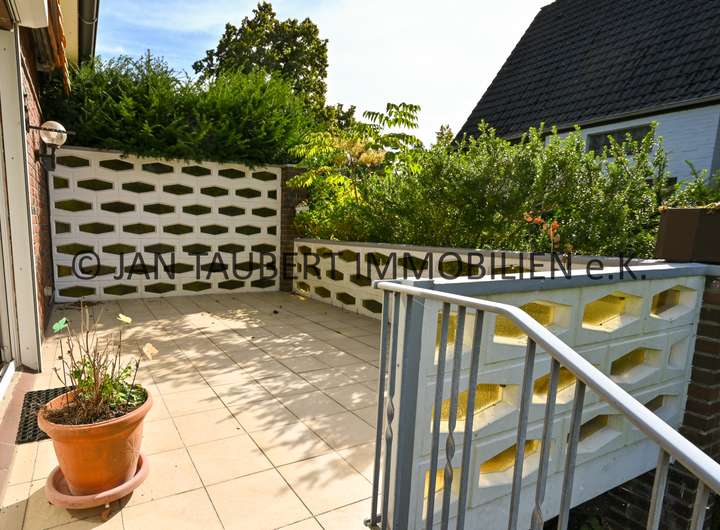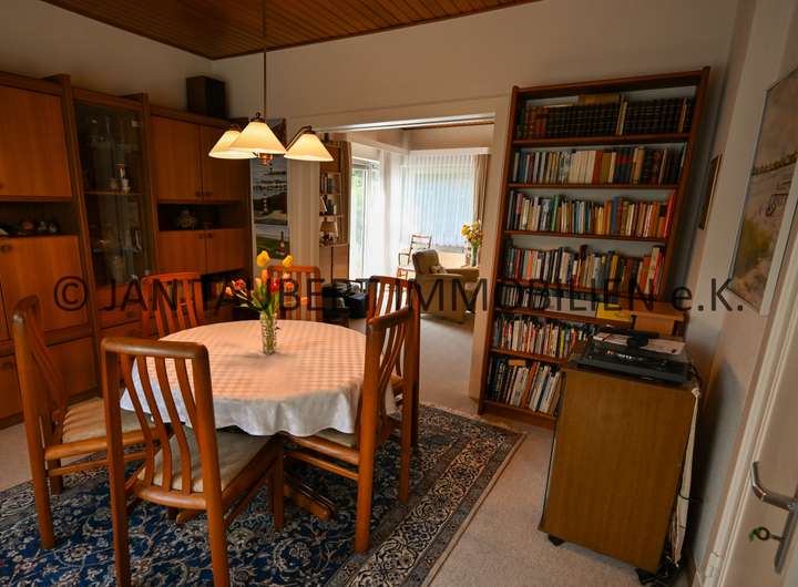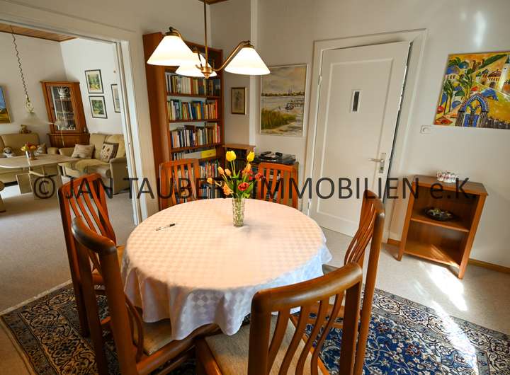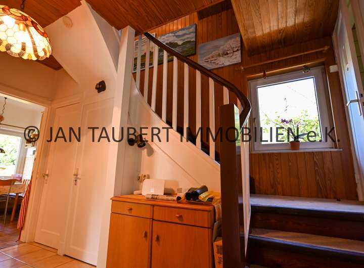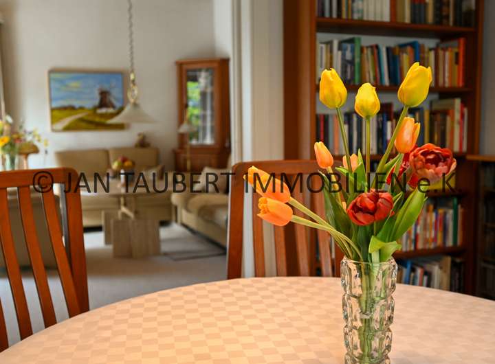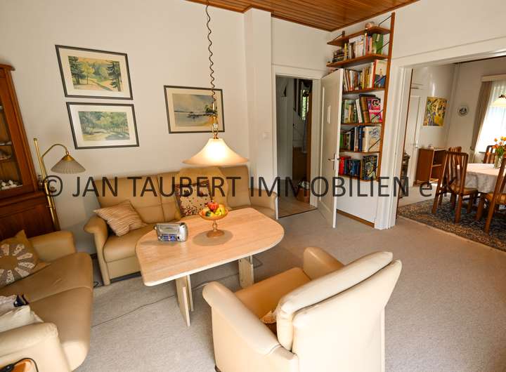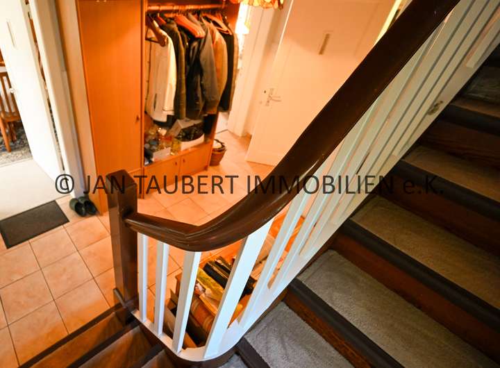 Erdgeschoss: heller Wohnbereich mit seitlicher Terrasse (mit abgehender Treppe zum Garten), offener Durchgang zum Essbereich, Küche mit älterer Einbauzeile und Platz für Tisch, praktische Diele mit Platz für Garderobe, geschwungene Treppe ins DG, Gäste-WC mit Fenster, Bodenbeläge überwiegend Teppich oder Fliesen, große Sonnenterrasse mit Markise