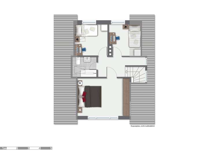 Obergeschoss: Dach als Krüppelwalmdach, voll ausgebaut, 3 Schlafräume mit Flur, Bad mit Wanne und WC, Spitzboden erreichbar über Einschubtreppe