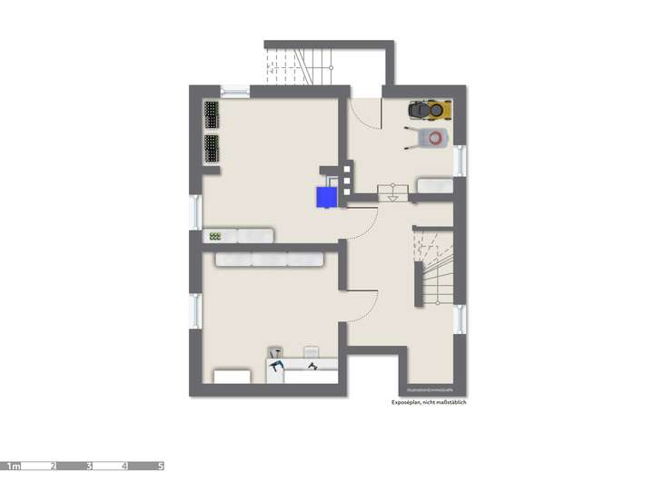 Untergeschoss: Vollkeller mit Heizungs-/Anschlussraum/Waschküche, 2 gut nutzbare Abstell-/Hobbyräume, Flur mit Platz für Schränke, Kelleraußentreppe