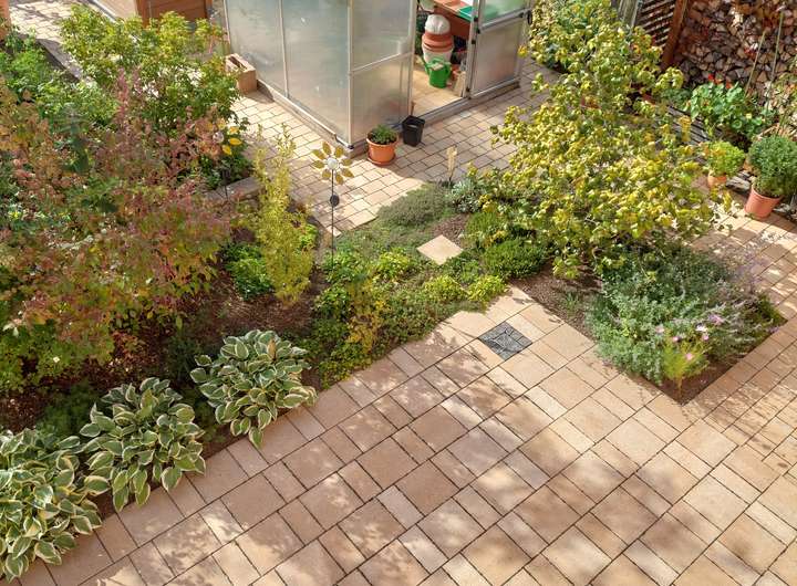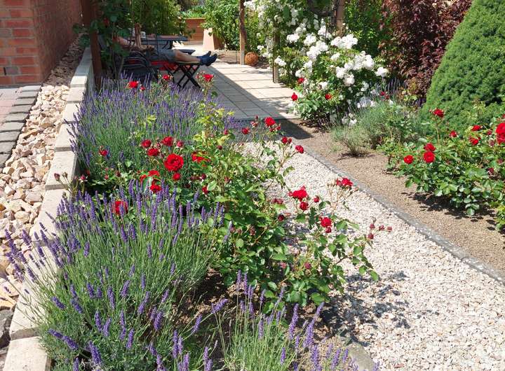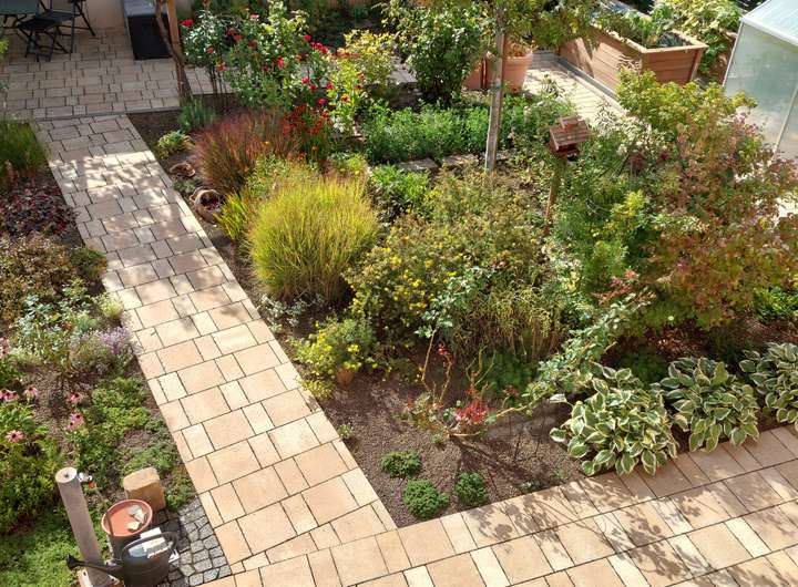 Grosser Stauden-/Nutzgarten, annähernd barrierefrei durch Pflasterung der Gehwege,