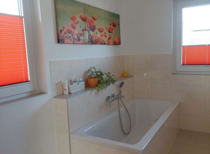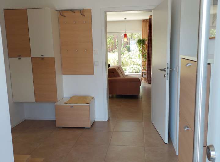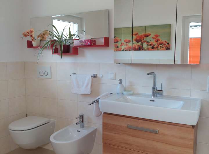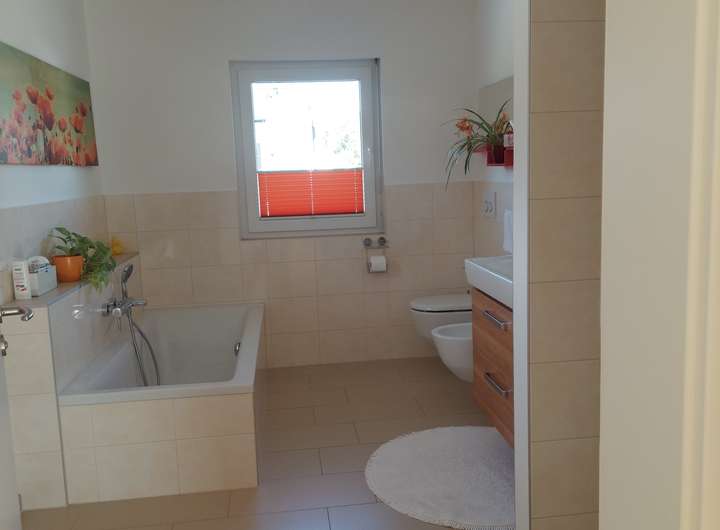Einheitliches Echtholzparkett in allen Räumen bzw. Fliesen in den Bädern