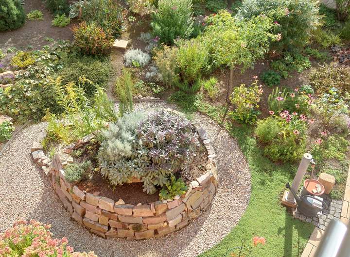 Gewächshaus, 2 Hochbeete, Kräuterspirale, Pergola, Brennholzregal