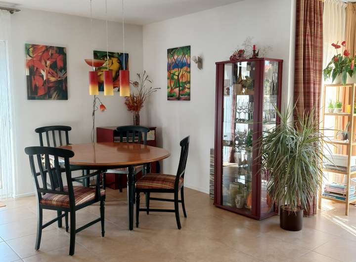 Einheitliche Bodenfliesen in allen Räumen, offene Bauweise Küche – Essen – Wohnen,