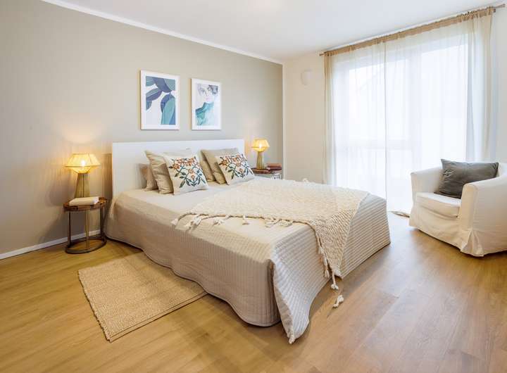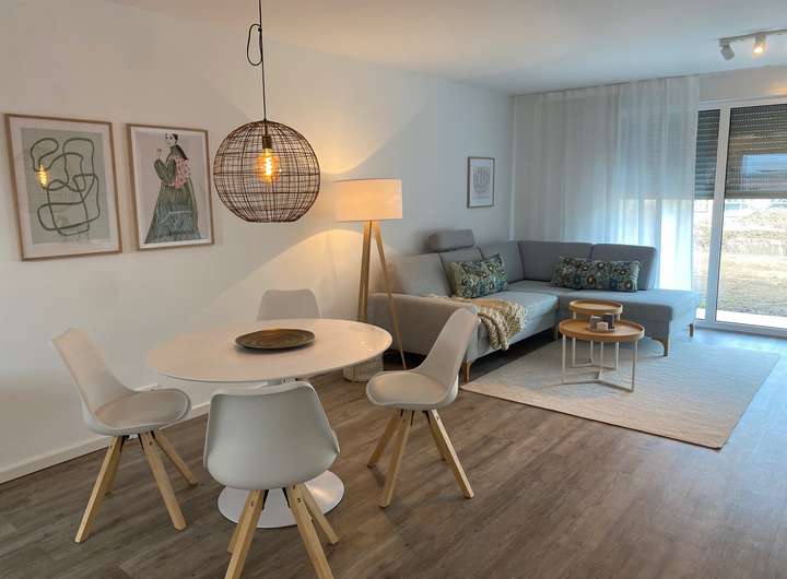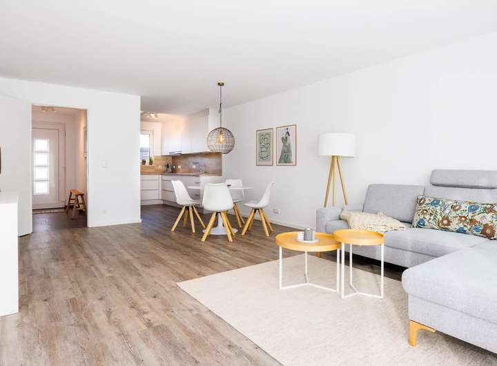 • Wohnzimmer, Küche sowie die Schlafzimmer sind mit einem hochwertigen Vinylboden ausgestattet.