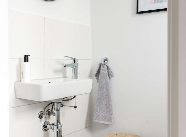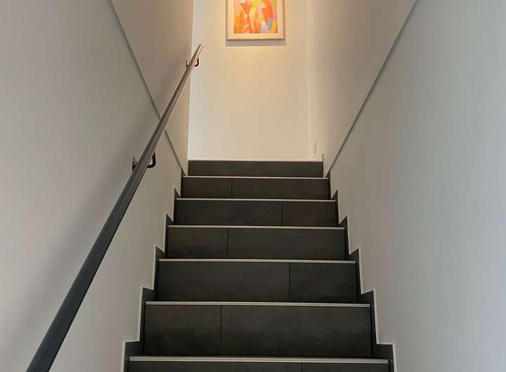 • Der Eingangsbereich, das Gäste-WC, das Badezimmer und beide Treppen sind modern gefliest.