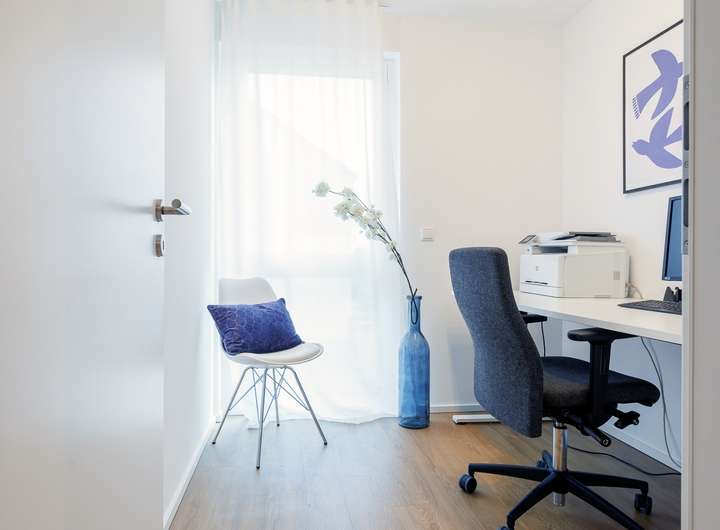 Im Obergeschoss befinden sich zwei helle Schlaf- oder Kinderzimmer, ein Arbeitszimmer sowie das moderne Badezimmer, das sorgfältig geplant wurde. Eine bodentiefe Dusche sowie eine separate Badewanne laden zum Relaxen ein.