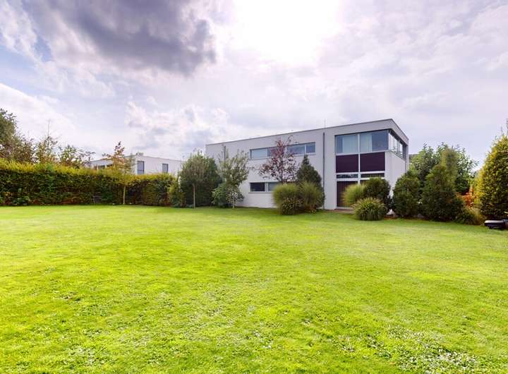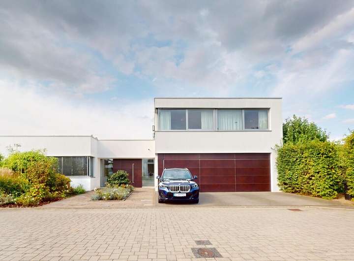 Der Außenbereich ist geprägt von einem uneinsehbaren Garten mit automatischer Bewässerung, vielfältigen Sitzgelegenheiten und einem begrünten Dach. Hier finden sich Rückzugsorte für jede Tageszeit – ob entspannt am Morgen, sonnig am Nachmittag oder atmosphärisch am Abend. Abgerundet wird dieses exklusive Angebot durch eine großzügige Garage für drei Autos, drei zusätzliche Außenstellplätze, Schüco Aluminiumfenster sowie ein Pachtgrundstückt.