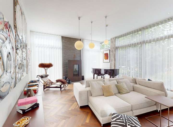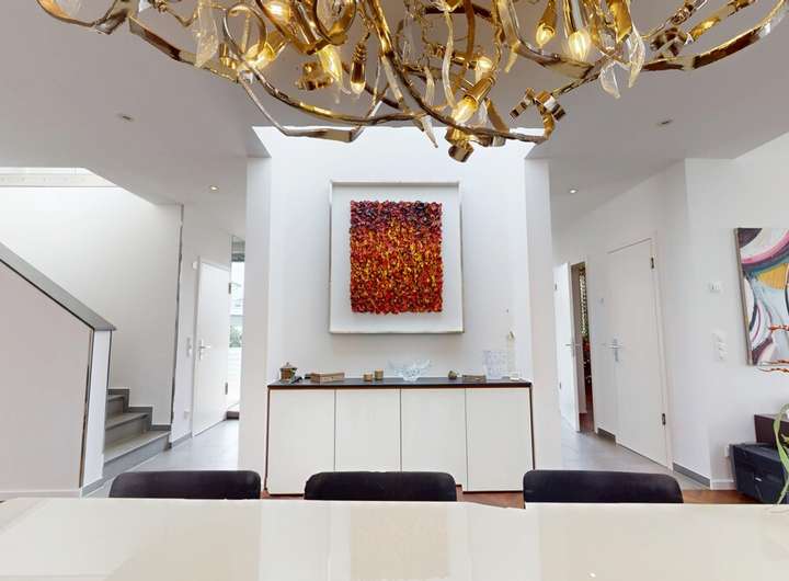 - Bodentiefe Tür- und Fensterelemente mit elektrischen Raffstores und einer beeindruckenden Raumhöhe von über 3 Metern