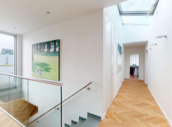 Das Obergeschoss bietet vier weitere, lichtdurchflutete Zimmer, zwei moderne Bäder sowie eine traumhafte Dachterrasse mit Blick ins Grüne – perfekt für die ganze Familie oder Gäste. Herzstück des Hauses ist der neu gestaltete Wohn- und Essbereich mit edlem Fischgrätparkett (2025), der durch raumhohe, bodentiefe Fenster und einer lichten Raumhöhe von über drei Metern ein außergewöhnliches Raumgefühl und den perfekten Rahmen für genussvolle Stunden schafft. Ein separater Fernsehraum eröffnet flexible Nutzungsmöglichkeiten – ob als Büro, Bibliothek oder gemütlicher Rückzugsort.