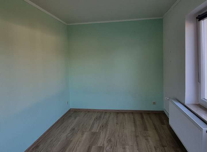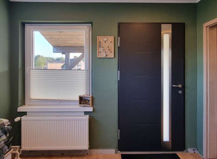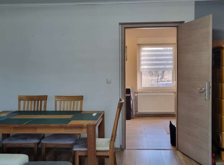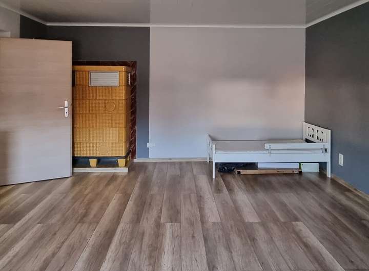 Das erste Zimmer hinter der Diele ließe sich im Bedarfsfall mit einem Pellet-oder Kaminofen ausstatten. Momentan ist der Anschluss hinter einer Gipskartonplatte verborgen, ließe sich aber aktivieren, z.B. wenn die Kinder größer sind.