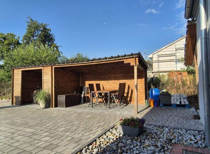 Im Kaufpreis enthalten ist auch die Garage und ein praktischer Schuppen und so manche schöne Pflanze.