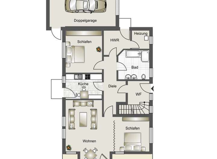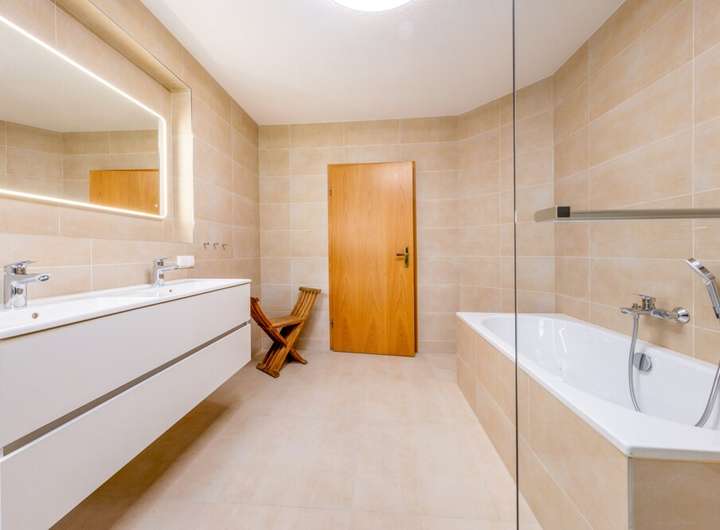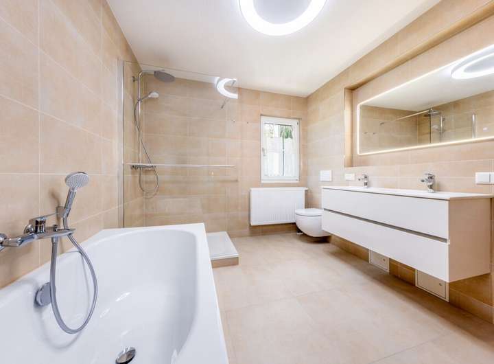 Gartenseite mit gegenüberliegenden Masterbad – 2025 komplett erneuert, Zugang zur Garage über HWR mit WM und Trockner, Heizungsraum (mit Fenster)