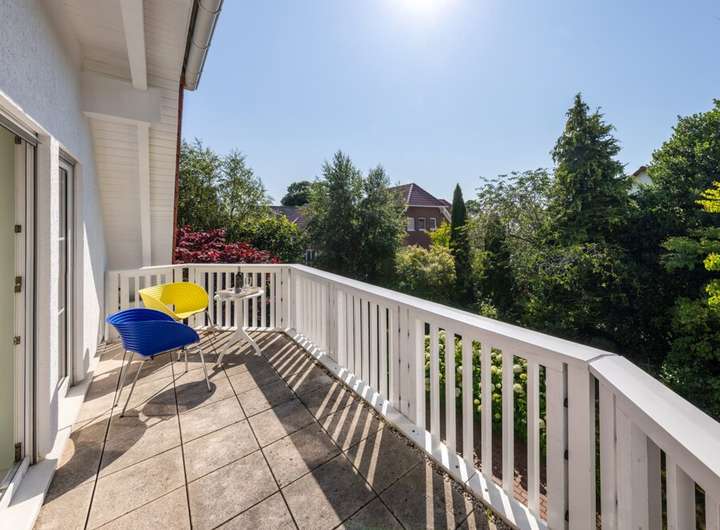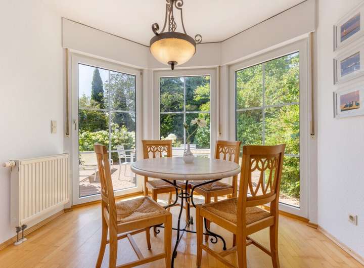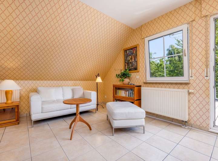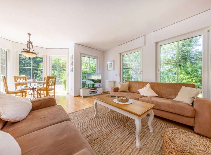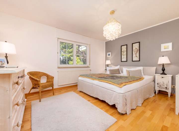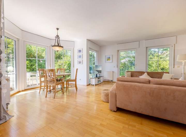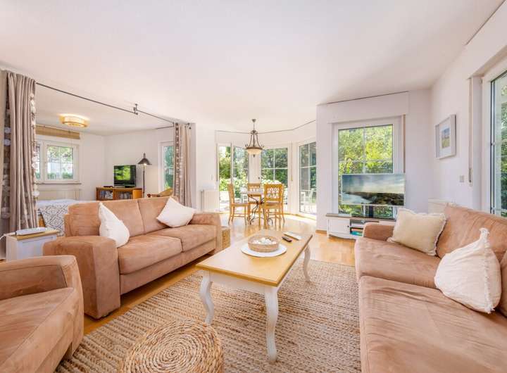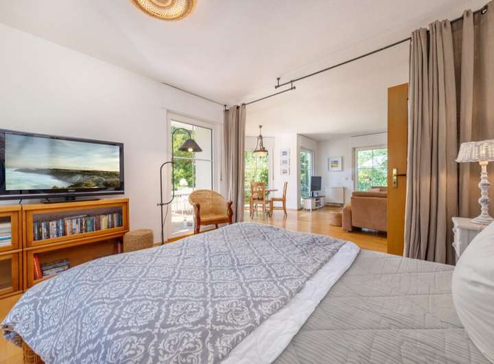 Wohnbereich vielen bodentiefen Glaselementen, schönem Erker und Blick in den idyllischen Garten und Terrasse mit Nachmittagssonne, 2. Schlafzimmer abtrennbar vom Wohnbereich, großzügiges Masterschlafzimmer zur uneinsehbaren