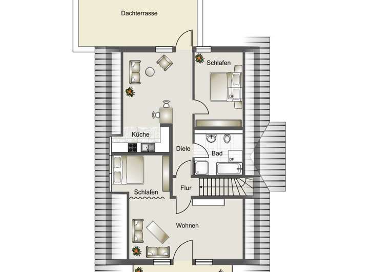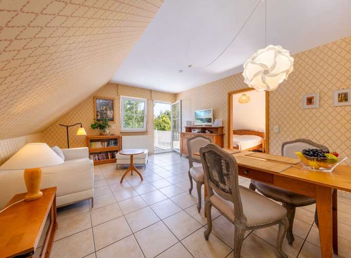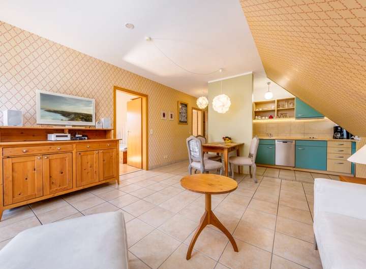 Dachterrasse (ca. 40 m²), Schlafzimmer, Bad mit Badewanne und Dusche, WM-Anschluss, helles Wohnzimmer mit Süd-Westbalkon, Wohnbereich noch abtrennbar für 2. Schlafzimmer, große Trapezgaube sorgt für gutes Raumgefühl