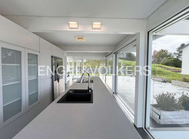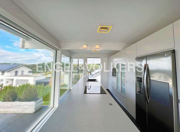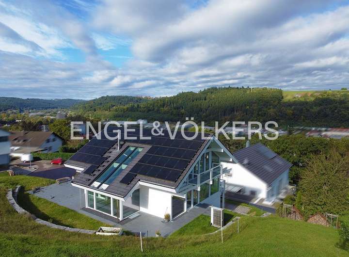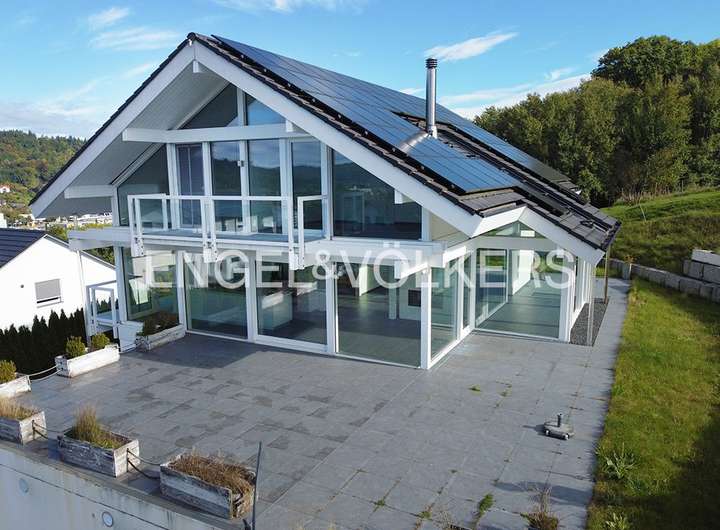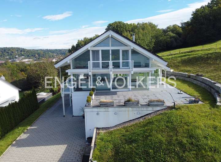 Hier haben Sie den Durchblick – und den Weitblick über Schwäbisch Gmünd. Glas, Glas und noch mehr Glas prägen dieses außergewöhnliche Zuhause, dessen Architektur in jeder Linie Einzigartigkeit ausstrahlt. Ein DAVINCI Haus, gebaut in Holzständerbauweise, welches die Faszination von Holz und Glas vereint, höchste Designansprüche erfüllt und nachhaltige Bauweise harmonisch integriert. Dieses Einfamilienhaus aus dem Jahr 2016 liegt in ruhiger Hanglage am Ende einer Sackgasse und öffnet sich mit voller Kraft in Richtung Panorama. Auf ca. 243 m² Wohnfläche entfaltet sich ein Wohnkonzept, das seinesgleichen sucht: modern, klar, elegant und dennoch wohnlich. Durch die Hanglage betritt man das Haus im Untergeschoss, wo sich zwei flexibel nutzbare Zimmer sowie ein großzügiges Bad mit vorbereiteten Anschlüssen für eine Sauna befinden, sodass hier im Handumdrehen ein privater Wellnessbereich entstehen kann. Auch ein geräumiger Abstellraum sowie der Technikbereich sind hier geschickt integriert. Eine Etage darüber offenbart sich das Herzstück des Hauses: der offene Wohn-, Ess- und Kochbereich, mit zusätzlichen Dachfenstern, welche noch mehr Licht hereinfluten lassen. Nur eine Wand, der Rest pures Glas und zusätzlich – mit einem Ausblick, der einem jedes Mal aufs Neue den Atem raubt. Ob beim Kochen, beim gemütlichen Abend vor dem zweiseitig verglasten Kamin oder beim Frühstück auf der umlaufenden Terrasse – die große Glasflächen lassen die Grenzen zwischen Innen und Außen verschwimmen. Im Obergeschoss setzt sich die architektonische Raffinesse fort: Eine Galerie eröffnet den Blick hinunter in den Wohnraum, hohe Decken schaffen Weite und Leichtigkeit. Zwei geräumige Kinderzimmer sowie der Elternbereich mit Schlafzimmer, separater Ankleide und einem Badezimmer, welches eher einem luxuriösen Spa gleicht, komplettieren diese Etage. Der gesamte Elternbereich öffnet sich zur naturbelassenen Wiese auf dem ca. 1.581 m² großen Grundstück, welche sich bis zum angrenzenden Wald erstreckt. Absolute Privatsphäre ist garantiert und mit etwas Glück sieht man am Morgen sogar ein Reh vor dem Fenster stehen. Technisch ist das Haus ebenso perfekt ausgestattet wie gestalterisch: Eine moderne Wärmepumpe mit Fußbodenheizung und eine Photovoltaikanalage sorgen für eine nachhaltige Energieversorgung und erhebliche Einsparungen bei den Stromkosten. Die Doppelgarage mit direktem Zugang ins Haus und zwei zusätzlichen Stellplätzen runden das Gesamtbild ab. Haben Sie nun den Durchblick oder lassen Sie sich schon vom Ausblick verzaubern? Denn wer im Glashaus sitzt, genießt bekanntlich den besten Weitblick.