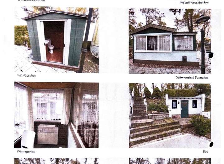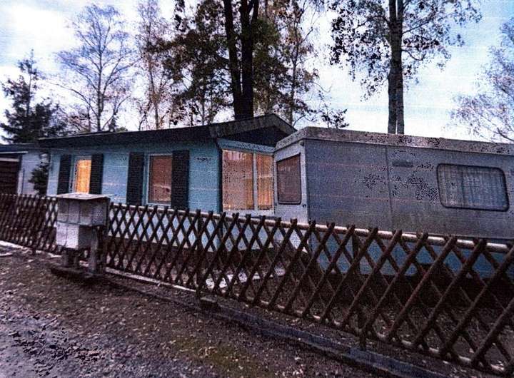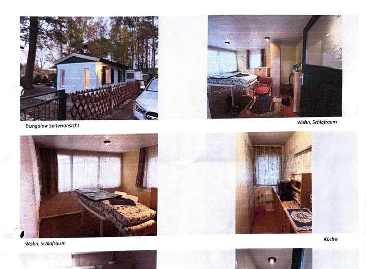 Ebene: Hier befindet sich der Hauptbereich mit einem charmanten Bungalow, einem separaten WC-Häuschen und einem Wohnwagen. Das gesamte Grundstück ist eingezäunt und bietet eine Zufahrt für Pkw sowie einen Stellplatz.