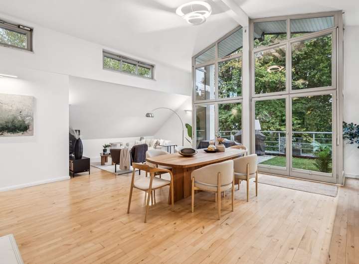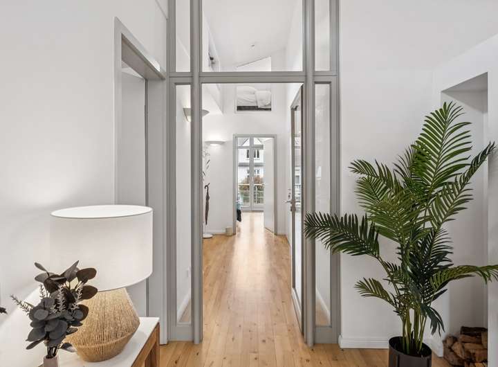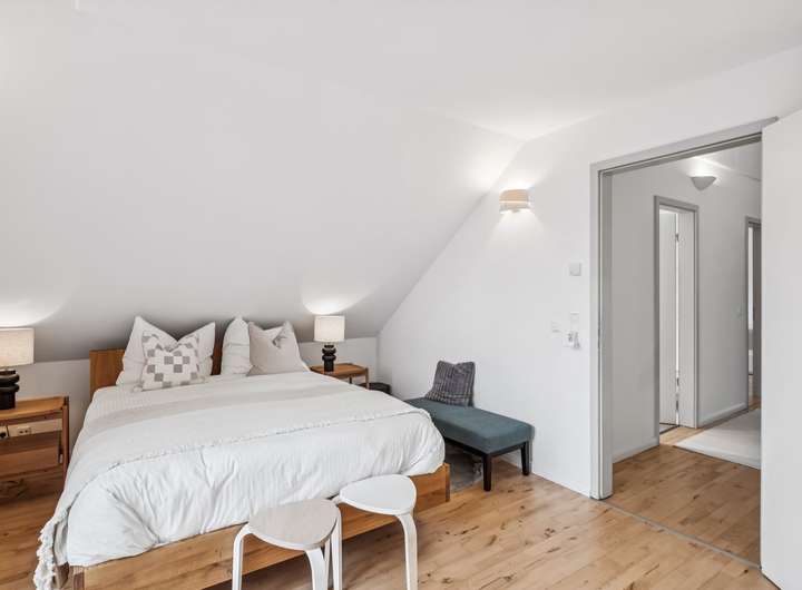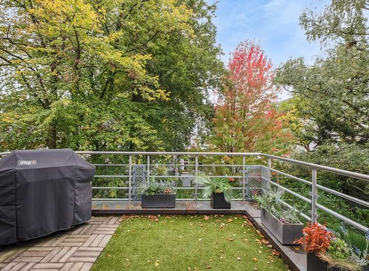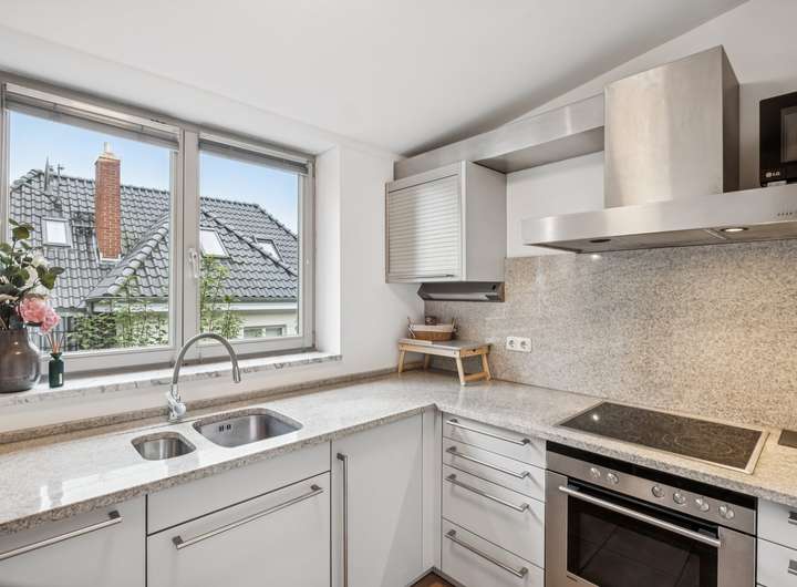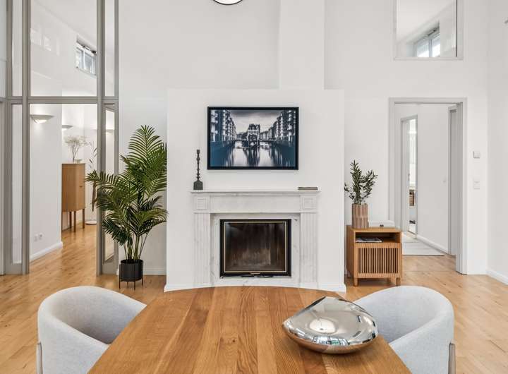Herzlich willkommen in einem besonderen Penthouse in Groß Flottbek. Beim Betreten der Wohnung werden Sie durch einen offenen Flur empfangen, der durch zahlreiche Fenster viel Tageslicht erhält. Der großzügige Wohn- und Essbereich überzeugt mit einer großen, bodentiefen Fensterfront, die für optimale Lichtverhältnisse sorgt. Angrenzend befindet sich ein geräumiger Balkon mit Sitzecke und einem Weber-Grill. Im Zentrum des Raumes liegt der Essbereich mit Blick auf den Kamin. In einer Ecke des Raumes befindet sich der gemütliche Wohnbereich, auf der gegenüberliegenden Seite die separate Kochinsel. Die hochwertige Einbauküche der Marke Siemens ist vollständig ausgestattet und bietet alle Geräte für den täglichen Bedarf. Die Wohnung verfügt über zwei Flure, die sich rechts und links vom Wohnbereich abgrenzen. Auf der Seite des Entreebereichs befindet sich ein Duschbad sowie ein weiteres Zimmer, das als Arbeitszimmer ausgestattet ist. Von hier aus besteht Zugang zu einem kleinen Balkon. Über eine Klettertreppe gelangt man von diesem Zimmer in die Galerieebene, auf der sich ein zusätzlicher Schlafbereich befindet. Auf der gegenüberliegenden Seite der Wohnung führt der zweite Flur zu einem Vollbad, dessen Badewanne mit einer Jacuzzi-Funktion ausgestattet ist. Hier befindet sich außerdem ein Hauswirtschaftsraum. Weiterhin gibt es ein Gästezimmer mit Arbeitsbereich. Am Ende dieses Flures liegt ein weiteres Schlafzimmer mit Zugang zur Galerieebene über eine Klettertreppe. Auf dieser Ebene befindet sich ein zusätzlicher Arbeitsbereich. Das Schlafzimmer bietet ebenfalls einen Ausgang zu einem kleinen Balkon. Zur Wohnung gehört ein Stellplatz in der Tiefgarage, der den Wohnkomfort abrundet. Das Penthouse wird vollständig möbliert vermietet und ist ab sofort bezugsfrei.