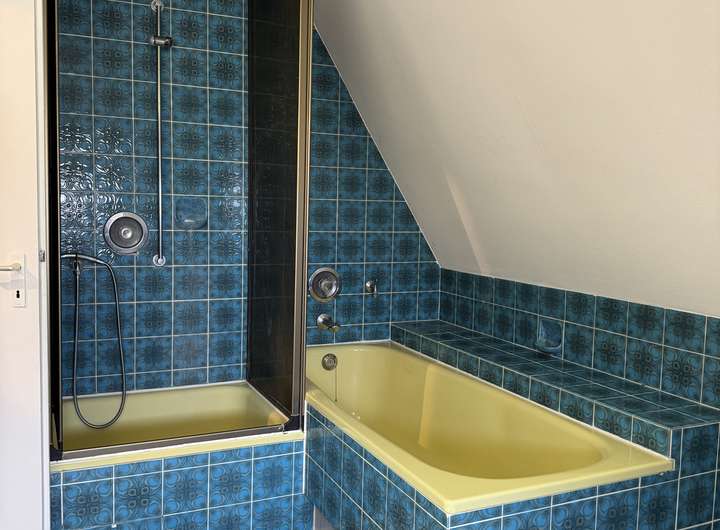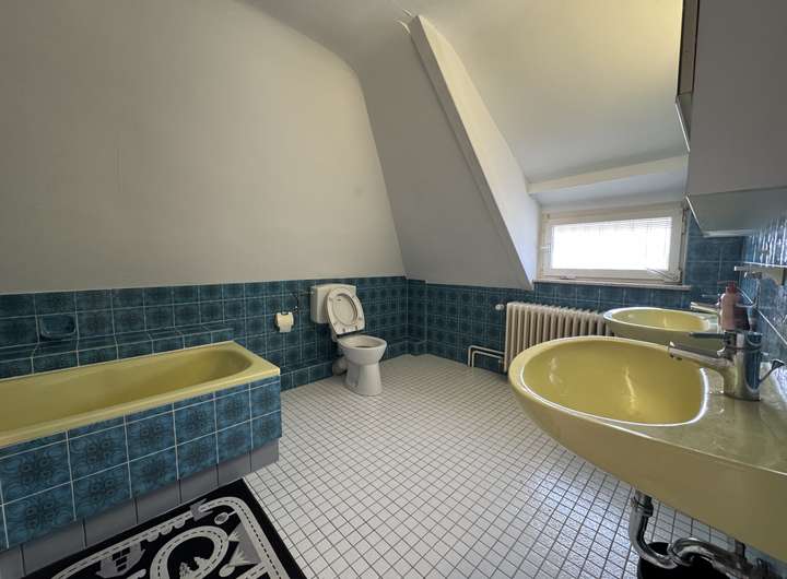 Im Obergeschoss: drei Schlafzimmer und ein großes Badezimmer mit zwei Waschbecken, Dusche und Badewanne 🛁