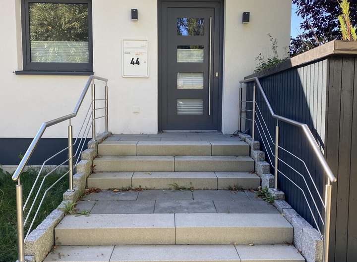 Neues Eingangspodest mit Treppenstufen, Beton/Granit