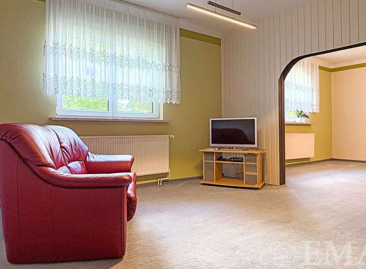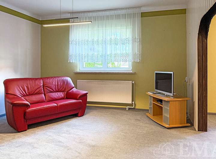 - Wohnzimmer mit Original-Holzdielen unter dem Teppichboden