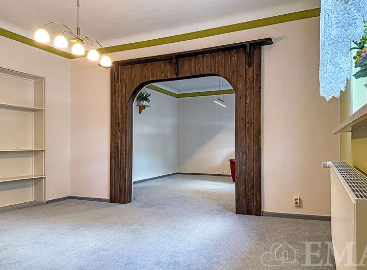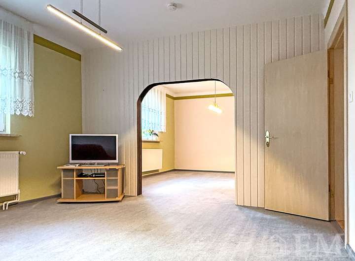 Im Erdgeschoss befinden sich zwei große Zimmer die mit einem Durchgang verbunden sind, eine Küche mit Einbauküche, eine Vorratskammer, ein Badezimmer mit Badewanne und Dusche, eine Veranda, ein Flur sowie ein Windfang. Im Windfang führt eine im Original erhaltene Treppe in das Dachgeschoss und im Flur eine Holztreppe in den Keller. Die Wohnfläche im Erdgeschoss beträgt ca. 78 m² und die Raumhöhe ca. 2,70 m.