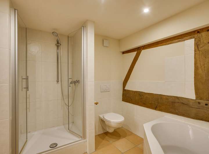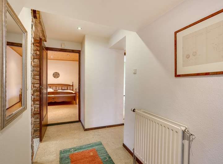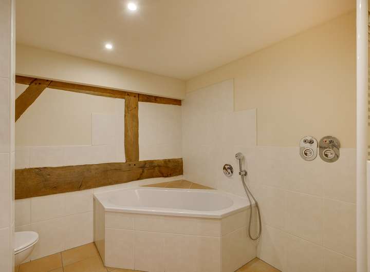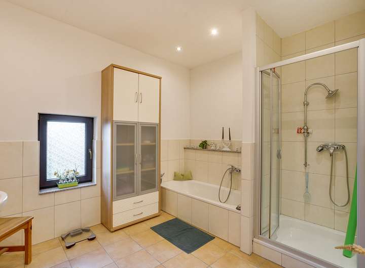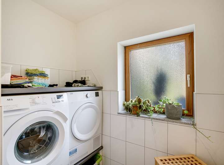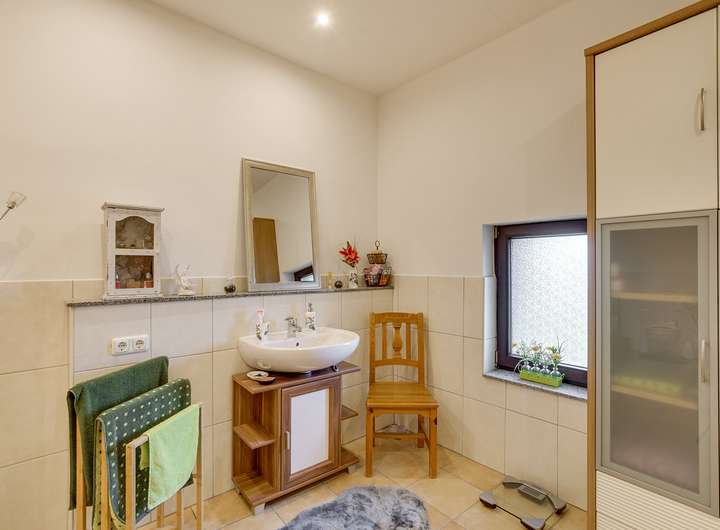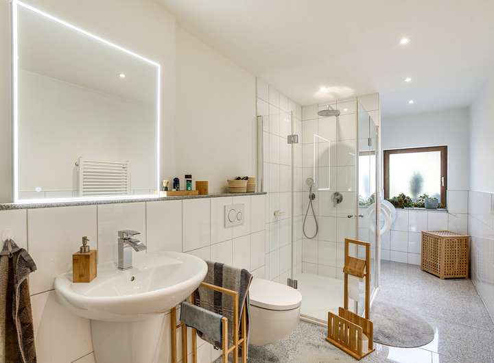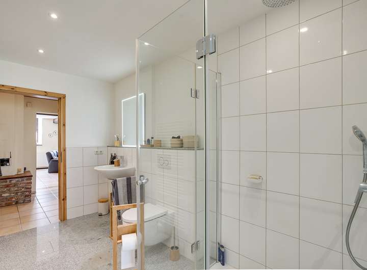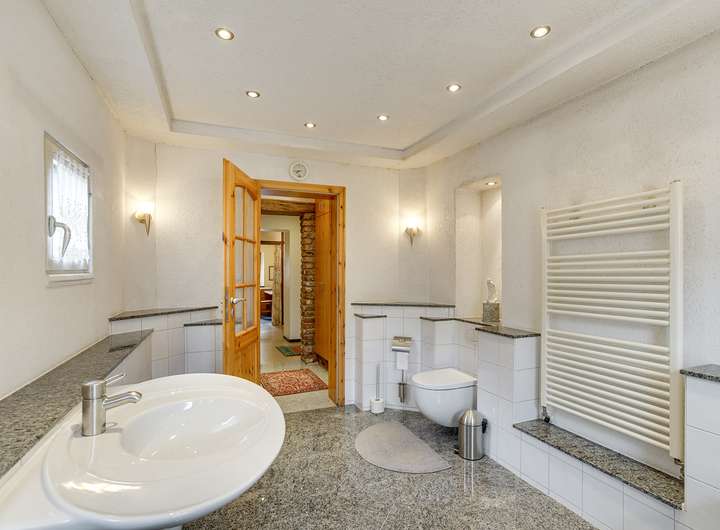 Insgesamt stehen 5 Badezimmer, teils hochwertig ausgestattet, zur Verfügung. Die Bodenbeläge aus Fliesen, Laminat und Naturkork verleihen den Räumen eine behagliche Atmosphäre. Der geschützte Innenhof mit verschließbarer Zufahrt schafft Privatsphäre, während zwei separate Gärten zusätzlichen Raum für Entspannung und Freizeit bieten.